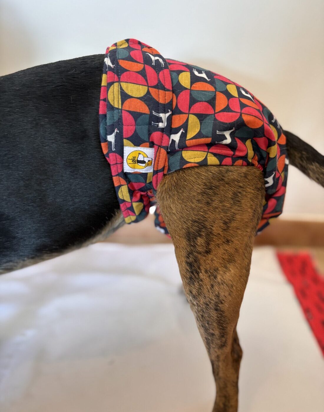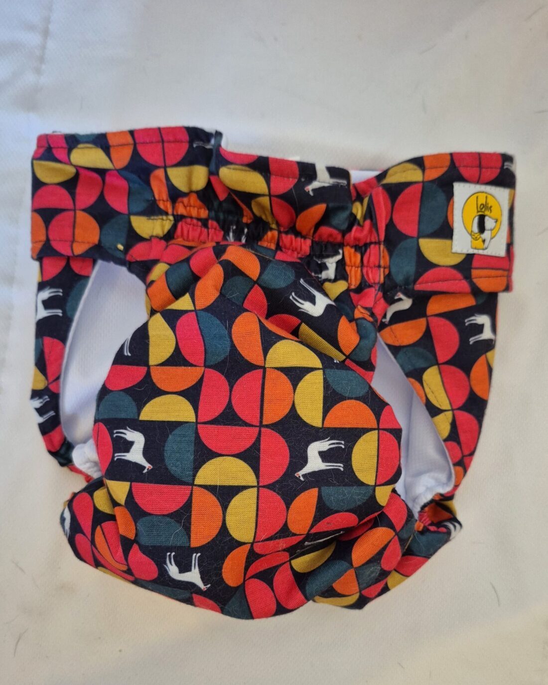Tiene velcros anchos super resistente, abertura para la cola y elásticos a los costados para que se ajuste bien al cuerpo de nuestro animal, sea cómodo y evite fugas.